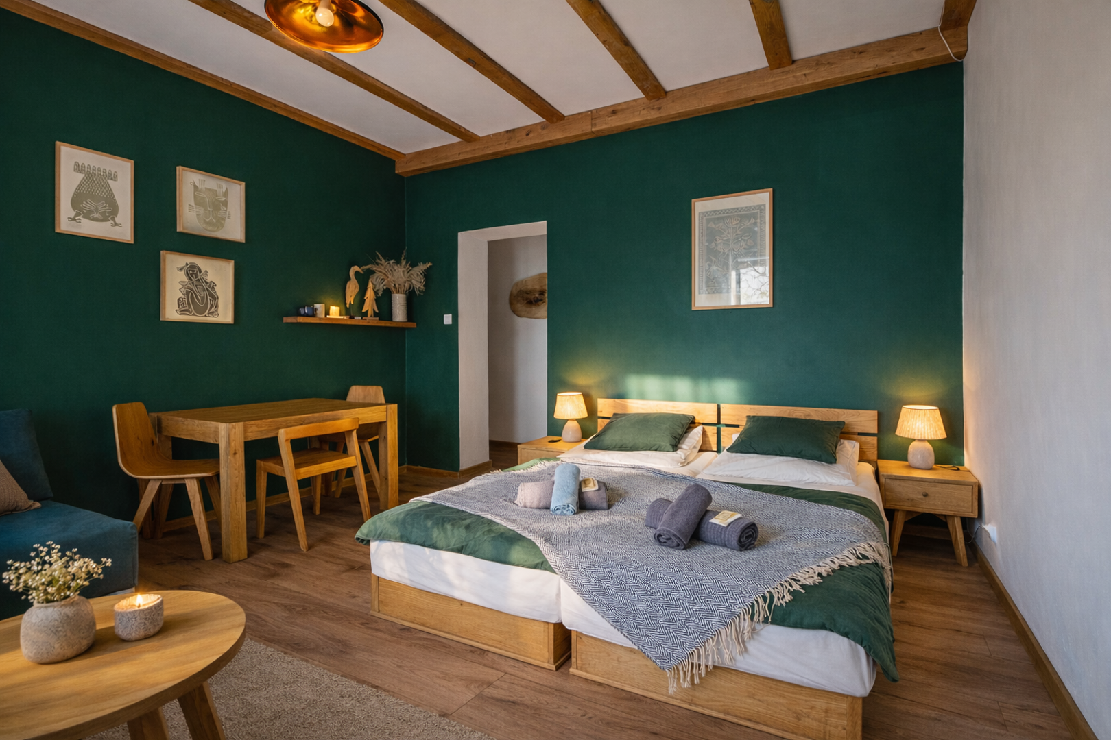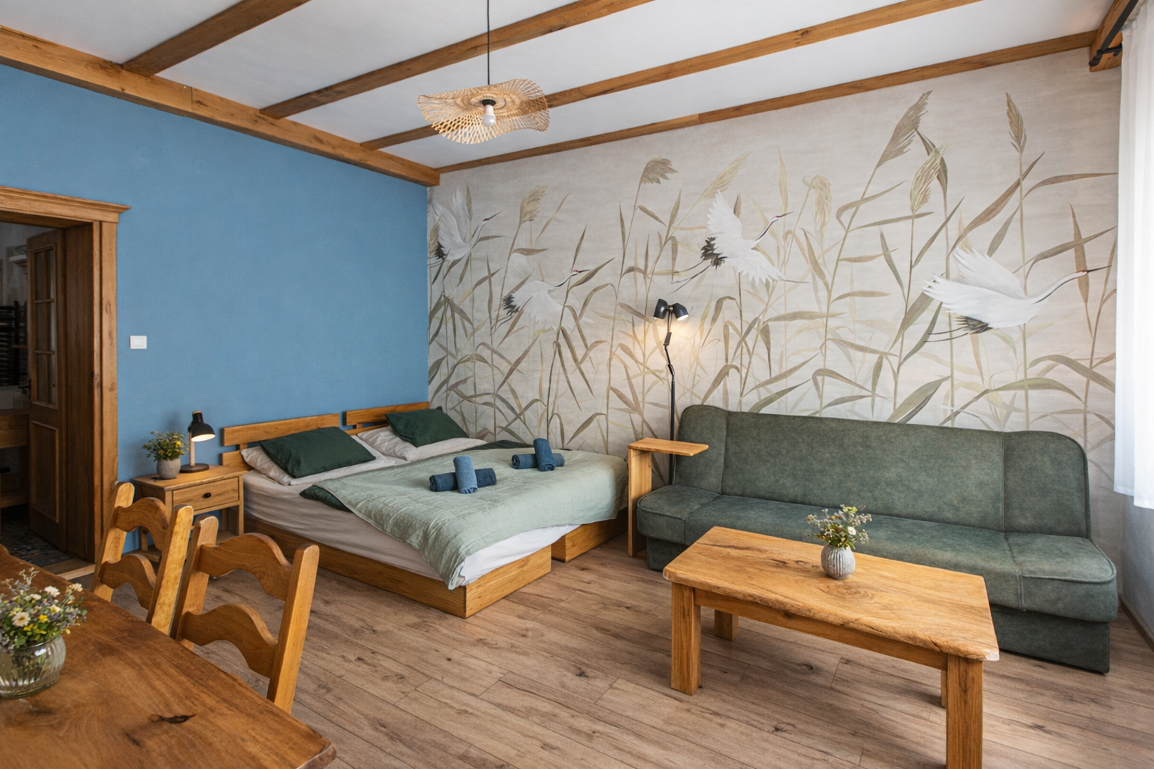Pokój Premium w Folwarku Wierzchy to idealna propozycja dla rodziców z dwójką dzieci lub trzech dorosłych, którzy szukają przestrzeni, wygody i bliskości natury. Pokoje znajdują się na parterze, co zapewnia łatwy dostęp i dodatkowy komfort – szczególnie dla rodzin z dziećmi. Wnętrza urządzone są w ciepłym, naturalnym stylu, z wykorzystaniem drewna, stonowanych kolorów i przytulnych dodatków. Przemyślany układ pozwala swobodnie wypocząć, a jednocześnie zachować funkcjonalność zarówno w dzień, jak i wieczorem. Układ i wyposażenie: dwa łóżka pojedyncze z możliwością połączenia w jedno duże wygodny narożnik lub sofa dwuosobowa – idealna dla dzieci lub dodatkowych Gości prywatna łazienka z prysznicem telewizor lodówka Czajnik i kubki bezpłatne Wi-Fi Udogodnienia dla Gości: dostęp do wspólnego aneksu kuchennego na korytarzu taras na pierwszym piętrze dostępny dla wszystkich Gości pełen dostęp do zielonej przestrzeni Folwarku Wierzchy – idealnej do zabawy, spacerów i relaksu prywatny parking zewnętrzny Pokój Premium to doskonały wybór dla tych, którzy chcą połączyć rodzinny wypoczynek z ciszą, naturą i komfortem. Przestrzeń sprzyja wspólnemu spędzaniu czasu, a spokojne otoczenie folwarku pozwala naprawdę zwolnić tempo i odpocząć